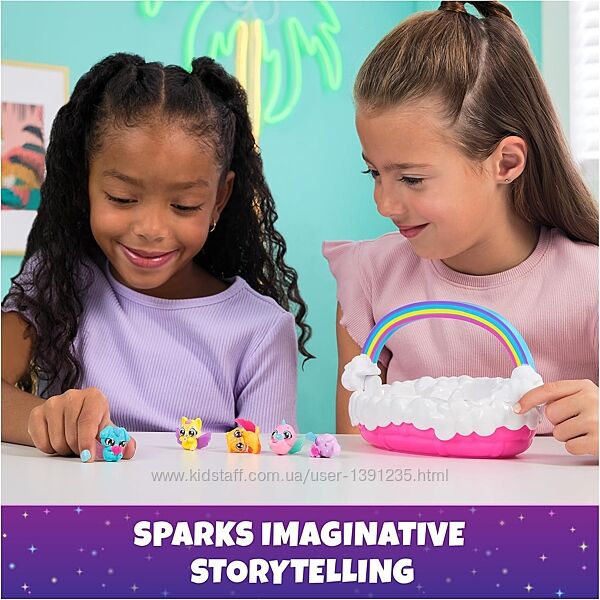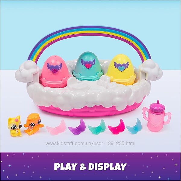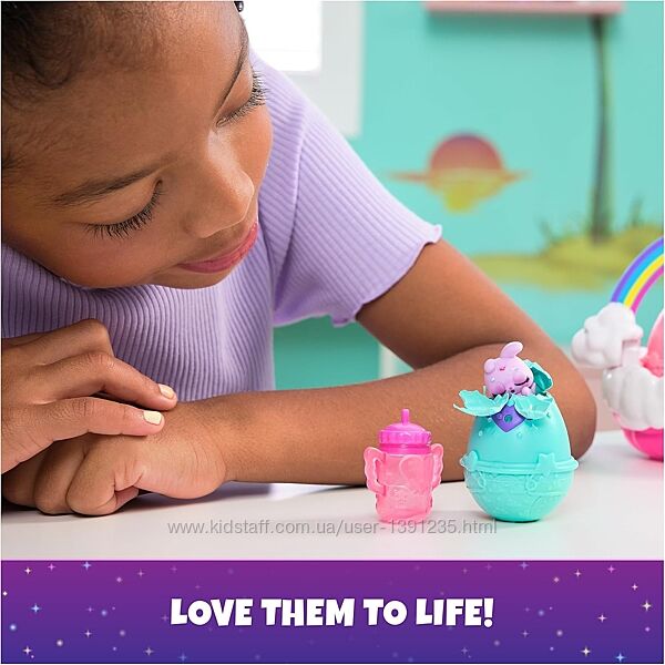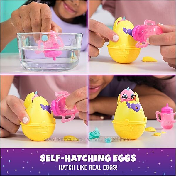3 яйця, що самостійно вилуплюються: Вигодовуйте яйця та почніть вилуплення, погодувавши їх. Вийміть пустушки, наповніть пляшечку водою, видавіть її в кожне яйце Hatchimals, і 3 друга вилупляться на ваших очах.
