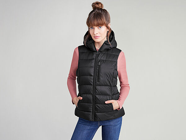 Жіночий зручний стильний жилет стеганий від бренду Esmara. Наповнювач із поліестеру. Вітер і водонепроникний. З екологічно нешкідливим просоченням. Водовідштовхуючий матеріал завдяки обробці BIONIC-FINISH® ECO. З капюшоном, блискавкою та захистом підборіддя. З нагрудною кишенею та бічними кишенями.Заміри: довжина 66.5, плечі 41.5,Пог 57.5