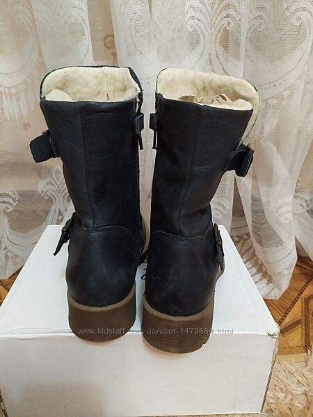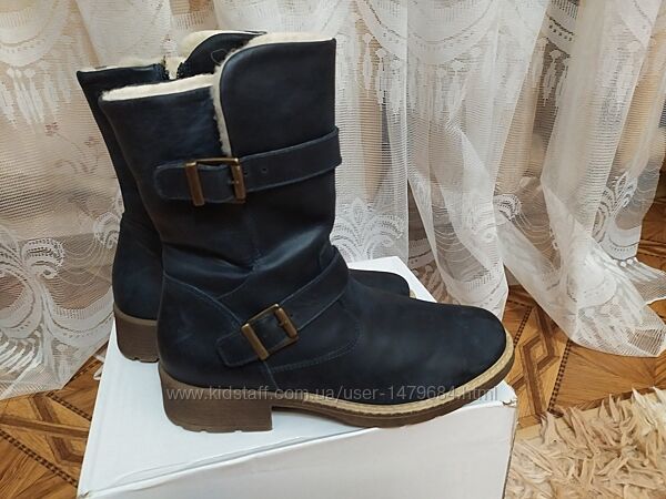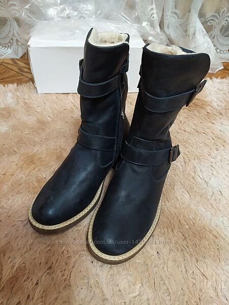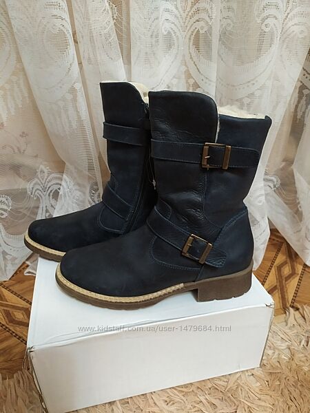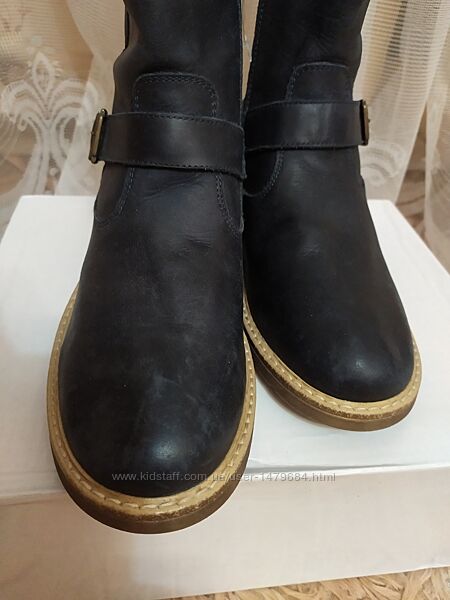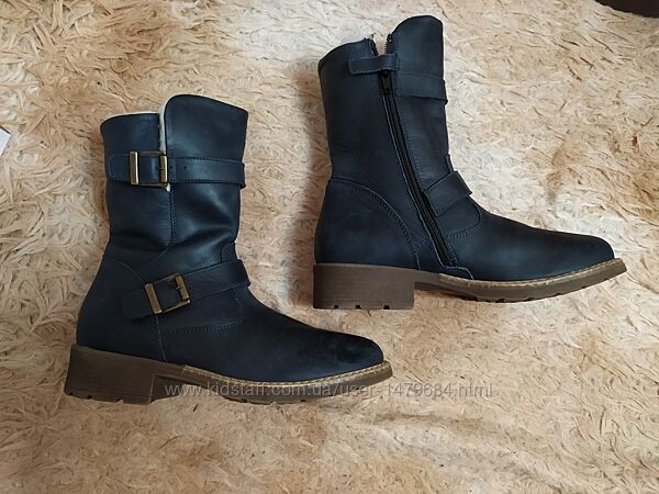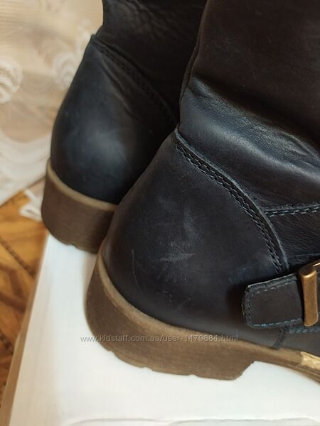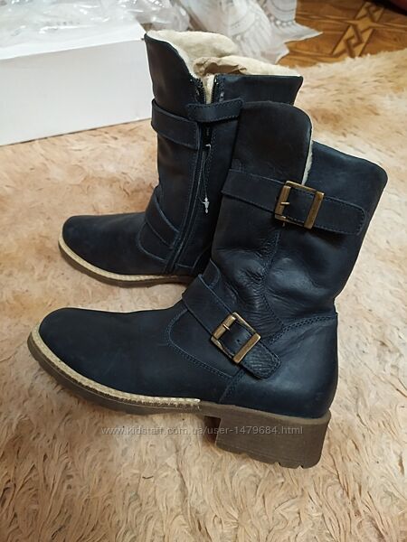 Класні черевики натуральна шкіра,сток,р. 37, але маломірять, підуть на ніжку 22,5-23 см, на худу стопу та худу литку. Колір темно-синій. Висота від пятки 18-21 см, каблук-3,7 см., ширина халяви-14 см..Дуже теплі, всередині щільне хутро.Ціна знижена, так як є дефекти в вигляді потертостей по всьому взутті, але треба поваксувати кремом і в принципі в носці це майже не помітно. На двох останніх фото показала потертості. Гарно виглядають на ніжці.