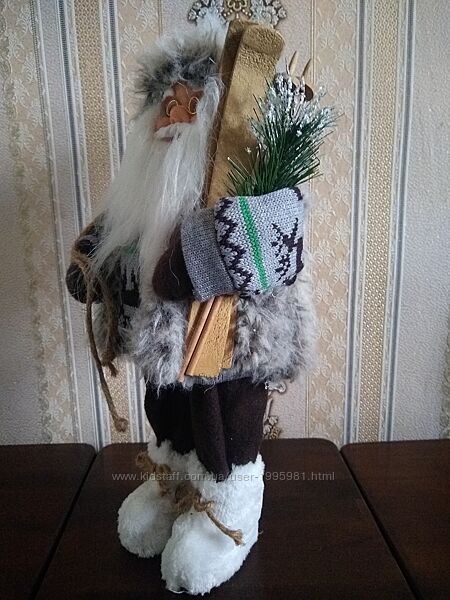 Яскравий Новорічний Різдвяний Санта Клаус з мішком , віником,лижами,та палками до лиж, створить вам новорічну атмосферу та новорічний настрій,гарно виглядає біля ялинки .Висота фігурки 45 см.