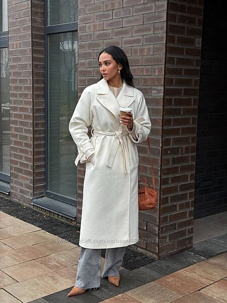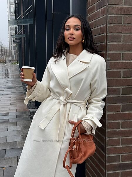 Воно має довжину міді, пояс на талії, який підкреслює фігуру, та широкі лацкани, що додають образу елегантності.