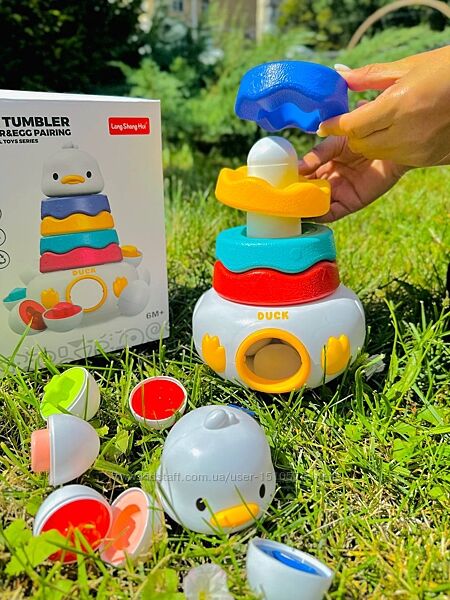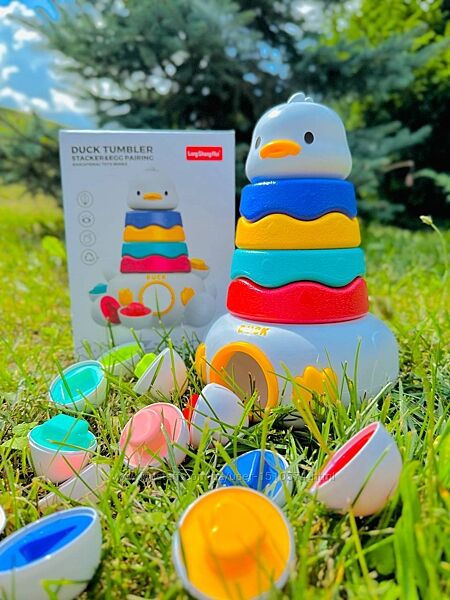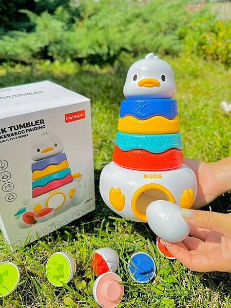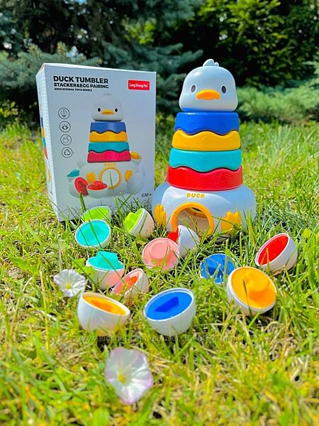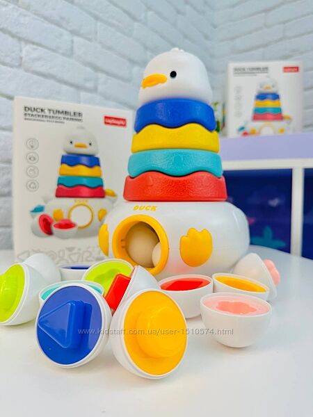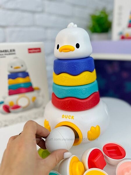 Уточка имеет 6 одинаковых белых яичек, у которые внутри спрятали маленькую тайну Если их раскрыть, то можно увидеть разные яркие цвета и фигуры, ведь это настоящий геометрический сортер