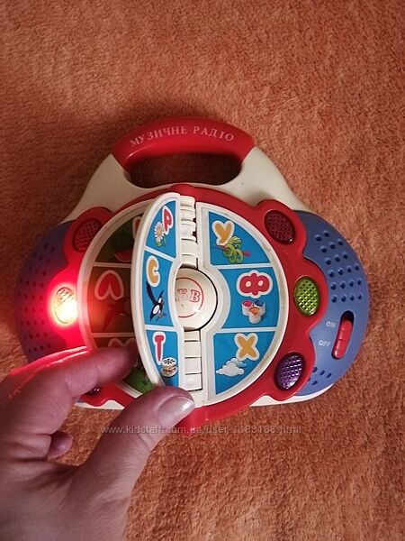 Музыкальное радио на українській мові, в очень хорошем состоянии, без деффектов, работает от трех пальчиковых батареек (не в комплекте), озвучивает буквы/слова, играет мелодия, мигает лампа на буквах.Способы оплаты и доставки :