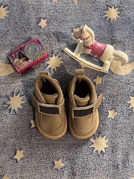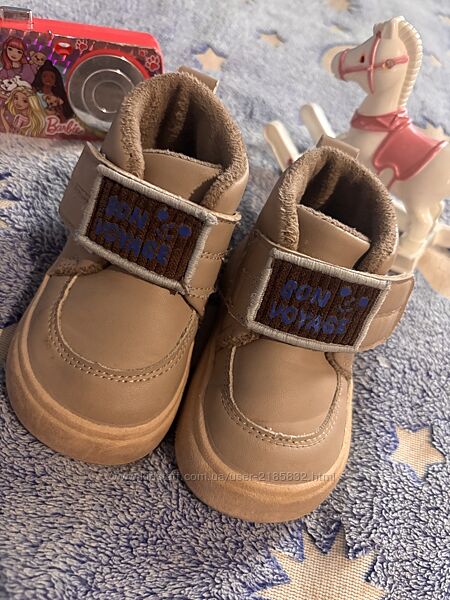 Теплі черевики на флісі носили осінь весна холодна бежевого/пісочного кольору. Зручна застібка на липучці з написом "BON VOYAGE". Мають високий задник. розмір 17