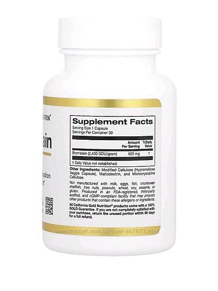 Подробное описание: California Gold Nutrition Бромелаїн 625 мг 30 капсул 07.2027
