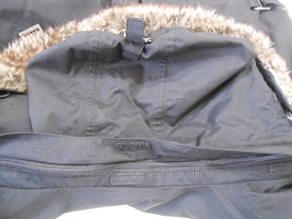 молния +липучки (впереди), карманы накладные сверху на замочке; внизу карманы большие двойные (1-на кнопках, 2-на замочке), два внутренних кармана, 1-на рукаве; воротник внутри – тканевый; на рукавах внутри немного теплого флиса; пояс куртки регулируется; внутри есть 2 кулиски для регулировки низу, б/у, состояние - хорошее; из нюансов: на кармане рукава нехватает кнопки (фото)
