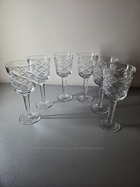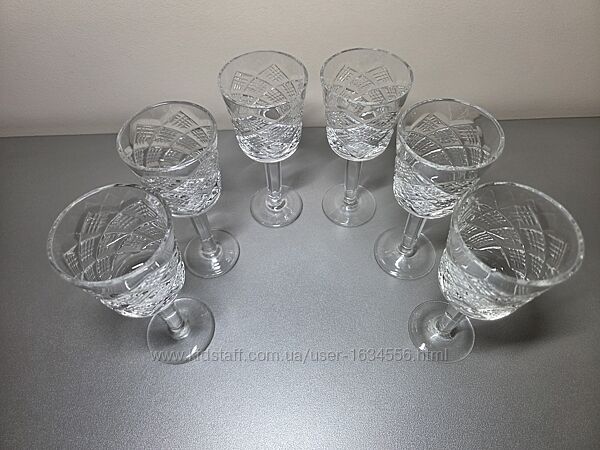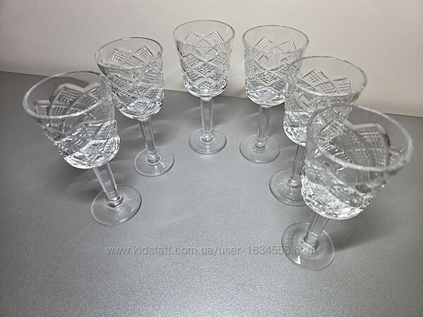 Ціна за набір на 6 штук.Набір кришталевих келихів (6 штук) для вина або лікерів. Мають висоту 10 см. Дизайн з різноманітними візерунками. Чудовий стан