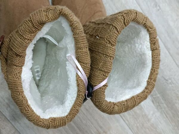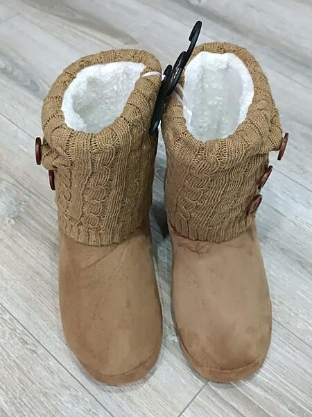 Відкрийте для себе ідеальне домашнє взуття із цими затишними тапочками-чобітками від бренду Ardene. Вони виконані із штучної замші. В´язане трикотажне оздоблення. Тепла підкладка із штучного хутра. Устілка з піни з ефектом пам´яті. Антиковзна прогумована підошва.Заміри: Розмір 9/10 устілка 26 см