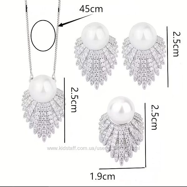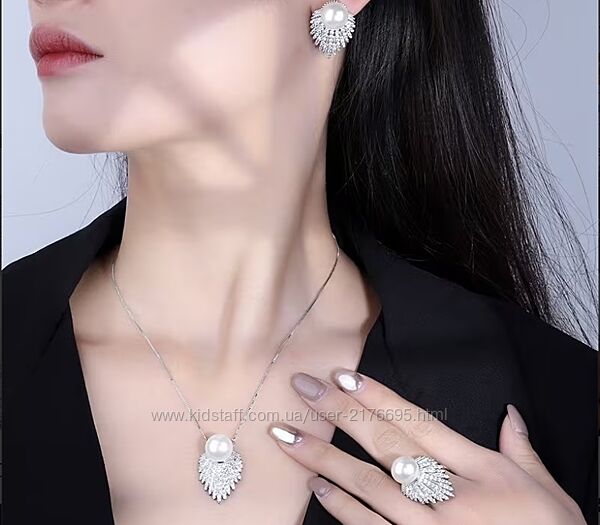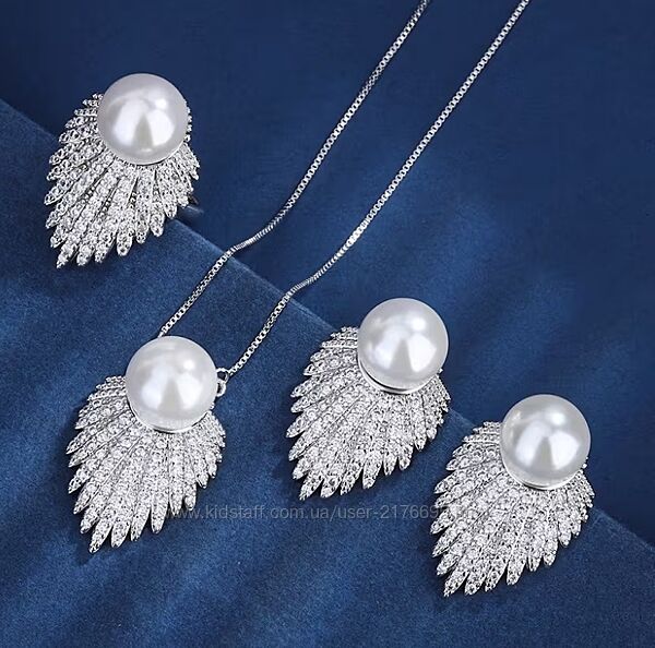 Набір прикрас з перлами та блиском кристалів – вишуканість, що привертає увагу!Цей комплект стане ідеальним доповненням до образу для особливих подій, вечірок, урочистостей або як стильний акцент у повсякденному вигляді. В основі дизайну – велика перлина з розкішною оправою у формі віяла, інкрустованою дрібними блискучими камінцями. Виглядає дорого та елегантно.