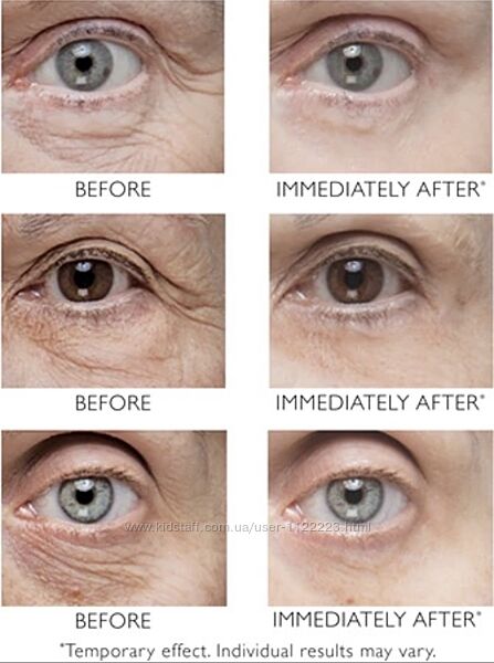 Стримує появу дрібних і глибоких зморшок, знімає набряки під очима. Покращення вигляду шкіри під очима вже через 3 хвилини. Підходить для делікатної шкіри навколо очей. Протестовано та схвалено офтальмологами.