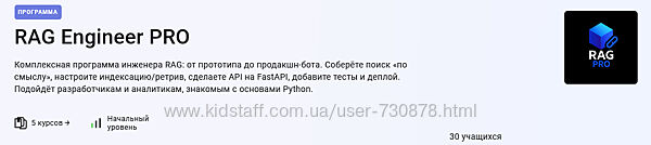 Алексей Малышкин [Stepik] RAG Engineer PRO (2025)Комплексная программа инженера RAG: от прототипа до продакшн-бота. Соберёте поиск «по смыслу», настроите индексацию/ретрив, сделаете API на FastAPI,