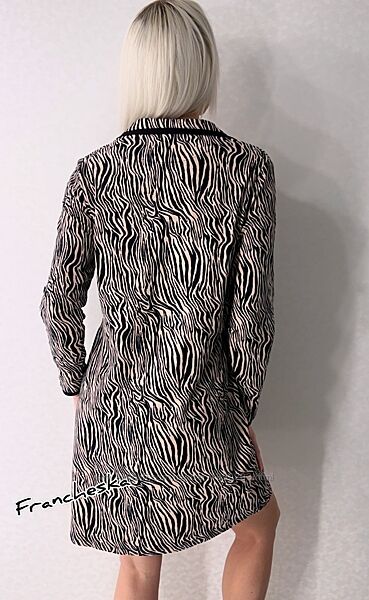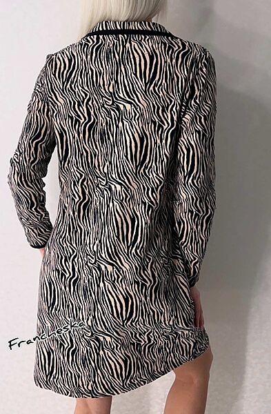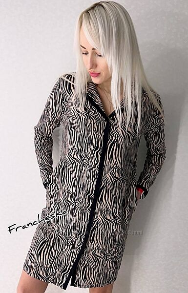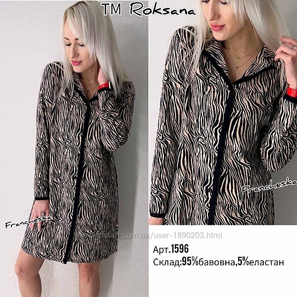Стильний жіночий халат на гудзиках з довгим рукавом з колекції "PINK GENIUS" (арт.1596) від українського виробника Roksana - це сучасна та комфортна модель, створена для щоденного домашнього використання.Халат виконаний із м´якого натурального трикотажу з модним принтом "зебра", він забезпечує максимальний комфорт у будь-яку пору року. Має вільний крій та злегка приталенний силует, довгі рукави та універсальна й зручна довжина вище коліна.