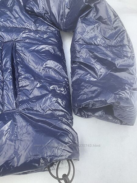 Куртка глянцевая, размер 42 европейский, обЪемная с цельнокроеным капюшоном, 2 прорезных кармана, утяжка внизу куртки и на капюшоне.Молния высоко закрывает шею, с переходом на капюшон до подбородка.