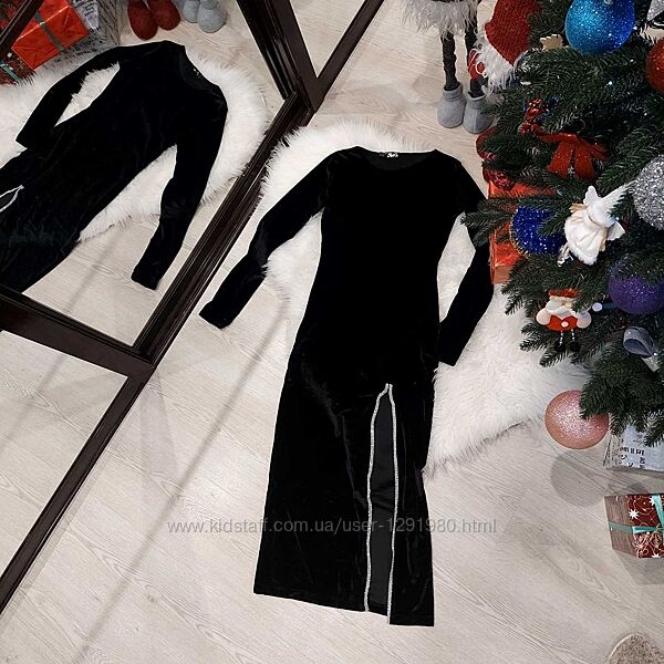 Сукня з розрізом по ніжці. Декорована камінням, яке дуже красиво сяє та переливається. У цій сукні ти виглядатимеш бездоганно — жіночно, розкішно і впевнено. Плаття, що створено для вечора коли хочеться сяяти. Тканина: королівський оксамит (дуже приємна на дотик) Розміри: 42-44, добре тягнеться. Кольори: чорний Стан ідеальний як новий. Заміри: Довжина: 116 см плечі: 34 см ПОГ: 37 см рукав: 57 см