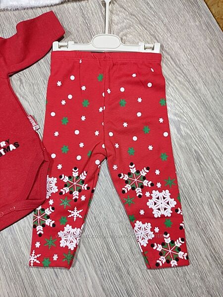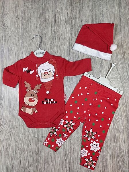 Набор боді, штанці та шапочка з новорічним малюнком. Добре підійде на подарунок або на святкову фотосесію. Всередині байка. На плечі кнопочки. Розміри 3, 9 місяців. Виміри:3 міс: боді- ширина плечей 20 см, довжина рукава від плеча 18 см, Пог 22 см, довжина виробу 35 см; штани- Пот 18 см, стегна 26 см, довжина виробу 38 см, крок 19 см.