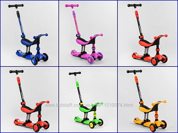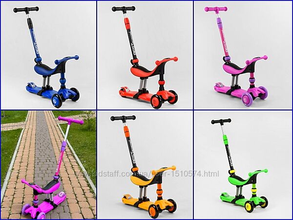 Функциональный трехколесный самокат с сиденьем и родительской ручкой и амортизаторами.