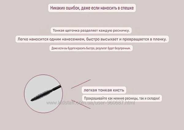| Эффект | Водостойкая, Для чувствительных глаз, Удлиняющая , Разделяющая |