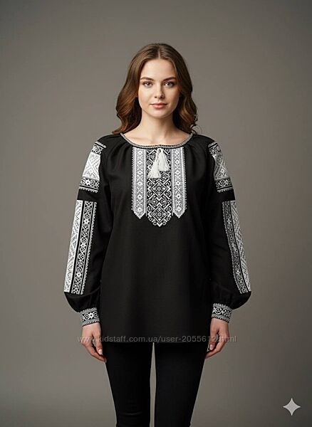 Подробное описание: Вишиванка жіноча лляна чорна з білим орнаментом