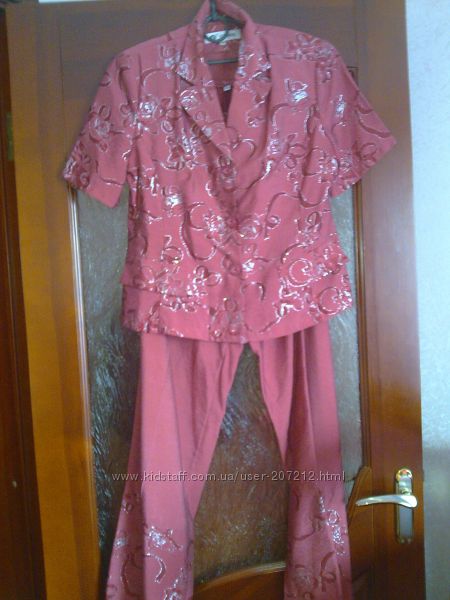 Эффектный брючный костюм-брюки + жакет. Малиновый в серебряные цветы, разм.46,брюки-длинна-106 см., ПОТ- 40, жакет-длинна- 59 . по спинке- 38. Одет 1 раз .Другие объявления продавца