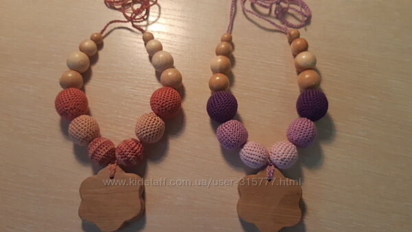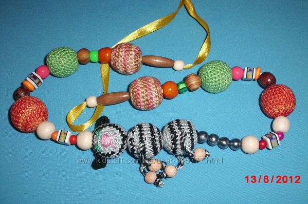 Плетені буси, намистинки. По перше це гарний аксесуар для мами та маленьких модниць, по друге це розвиваюча іграшка для малят. Слінгобуси незамінні коли ви на прогулянці з дитиною, в транспорті, стоїте в черзі, часто використовують при годуванні малюка. Яскраві, вони надовго займуть увагу вашого малюка за любих обставин. Розвивають мілку моторику пальчиків, виготовлені з натуральних хб ниток та дерев´яних бусин - бук, ялівець. Догляд, прання дитячим милом.Плету на замовлення різні варіанти, пропонуйте за бажанням.