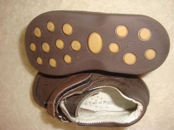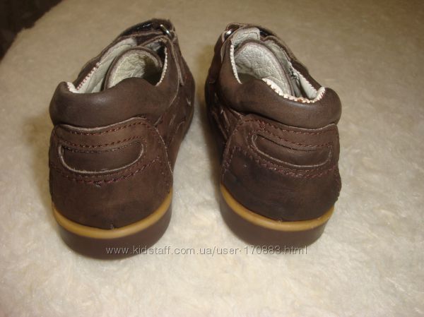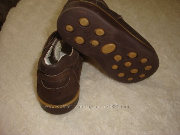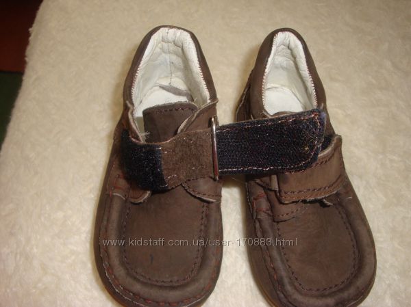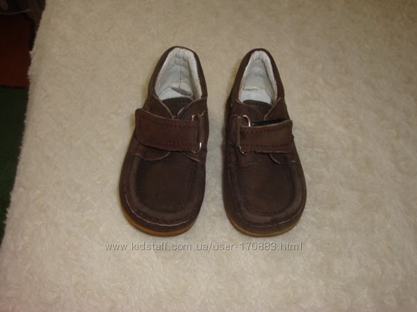 Снаружи кожа как дубленка матовая (нубук),внутри полностью кожанные, супинатор, застежка на липучке, можно регулировать подъем. Подойдут на широкую полненькую ножку с высоким подъемом ( такая у моего малыша ). Туфли довольно закрытые, могут сойти за короткие ботиночки, пока мы не подросли, весной одевала даже с махровым носочком.
