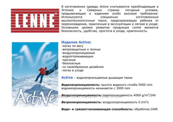 В изготовлении одежды Active учитываются преобладающие в Эстонии и Северных странах погодные условия, предъявляющие к изделиям особо высокие требования. Используются специально изготовленные высокотехнологичные ткани с наполнителем IsoSoft , предохраняющие ребенка от переохлаждения, практичные в эксплуатации и легкие в уходе. Изделия Active легки по весу ветрозащитные и теплые, воздухопроницаемые, водоотталкивающие, прочные, безопасные, со своеобразном дизайном, легки в уходе .