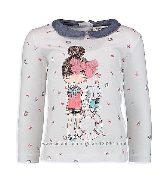 Фото 1-2- Нарядный РЕГЛАН с ДЖИНСОВЫМ Воротничком-принт-аппликация ДЕВОЧКА (бантик из ленточки) с КОТИКОМ и Спасательным кругом