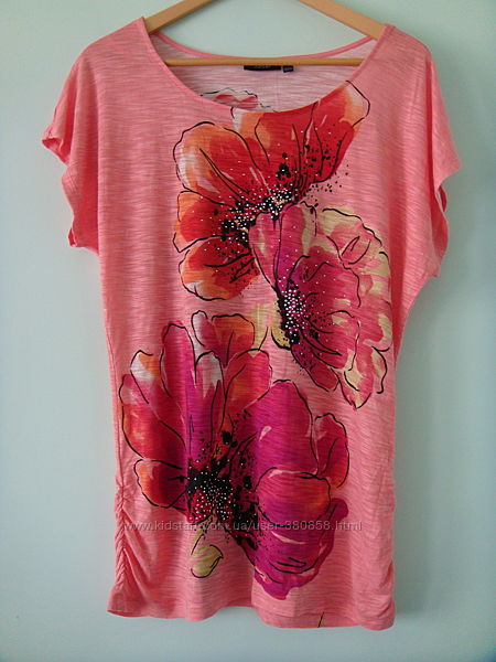 Фото 8 - туника АРТ9 из тонкой вискозы. Перед и спинка с узором. По бокам внизу швы задрапированы. Размер L. Длина - 73 см, пог - 52 см.