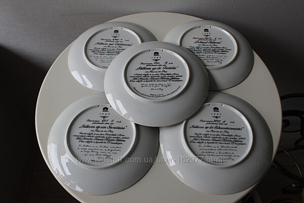 Каждая тарелка с золотой окантовкой по краю, имеют сзади клейма и индивидуальный номер по каталогу Брадекс.