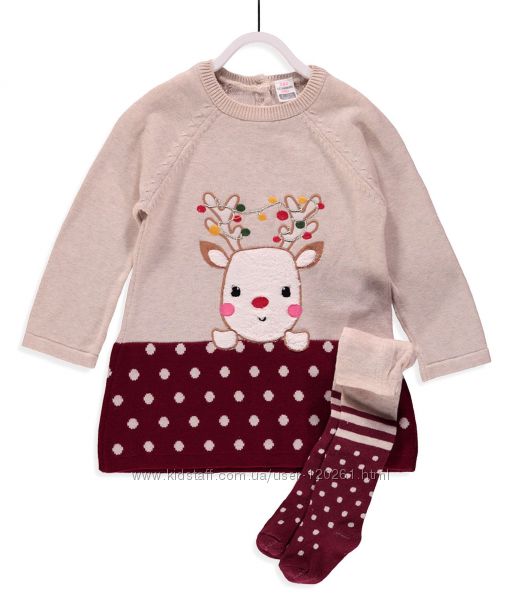 Фото 2- Вязаное Бежево-бордов ПЛАТЬЕ-ТУНИКА- Аппликация Плюшевый ОЛЕНЕНОК/На бордовом фоне бежевые горошки+ Теплые колготы (87%хлопок)Бежево-бордовые/горошки