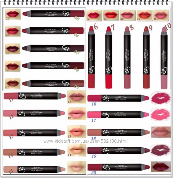 Бренд: Golden Rose. Помада-карандаш с бархатной, матовой и мягкой формулой. Увлажняющие компоненты, натуральные воски и витамин Е в составе питают губы и предотвращают их высыхание.