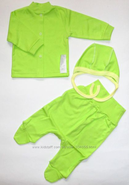 Комплект для новорожденных : штаны на еврорезинке, кофточка на кнопках, шапочка, пинетки, царапки (только в 56 размере).Материал: интерлок, 100% хлопок