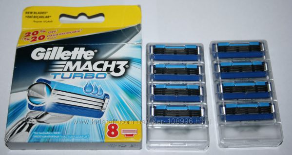 Настоящие оригинальные лезвия GILLETTE MACH 3 TURBО 8 штук в упаковке - 810 гривен, производство Германия (абсолютно новые картриджи - синего цвета, в сравнении с предыдущим турбо, здесь более тонкие лезвия и больше площадь смазывающей полоски).Лезвия действительно очень качественные.