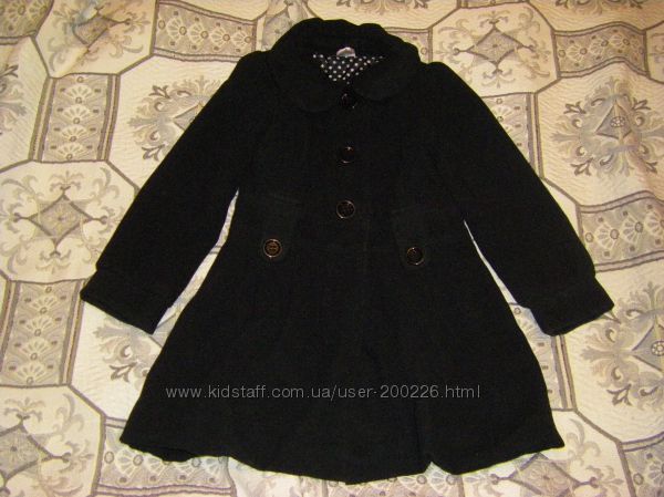Черное пальто Vintage Angels с круглыми пуговицами, шерстяное, приятное на ощупь, на шелковойподкладке в горошек. Без капюшона. На стройную девочку 5-6 лет, рост 116- 122 см.