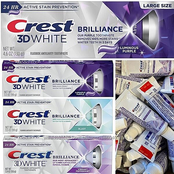 Crest 3D WHITE Brilliance LUMINUOS PURPLE toothpaste -ФІОЛЕТ ВІДБІЛЮЮЧА ПАСТА З НІЖНОЮ ПОЛІРОЛЛЮ toothpaste- з ФІОЛЕТОВИМ пігментом, ПРОТИ ЖОВТИХ ЗУБІВ - ЧУДОВО ПРАЦЮЄ ЗІ СМУЖКАМИ ДЛЯ ВІДБІЛЮВАННЯ