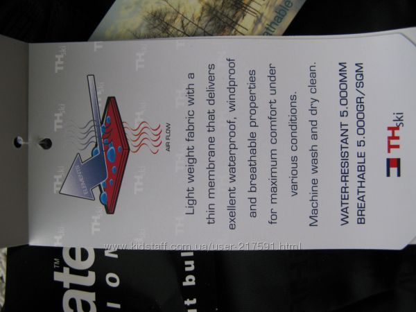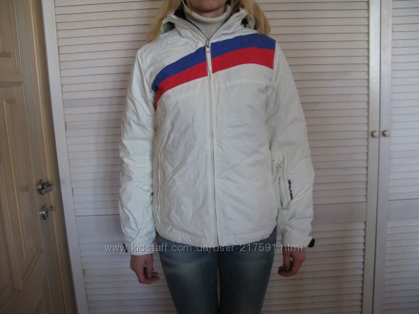 Куртка горнолыжная , верх - дышащая мембрана G-tex (водоотталкивающая), внутри утепляющая прослойка Thinsulate. Куртка имеет 4 кармана, один из них потайной на рукаве. В одном из карманов имеется карабин для ключей. Внутри куртки находится ветрозащитная юбка на резинке. Капюшон отстегивается.