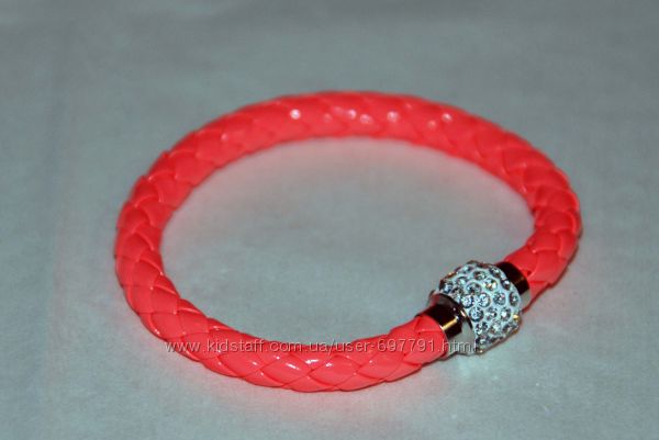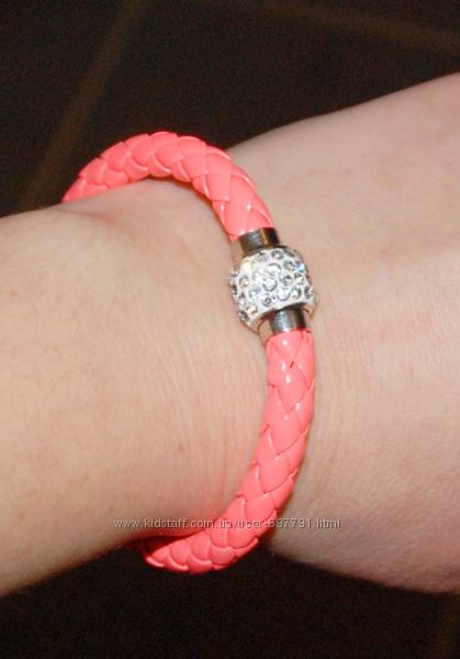 Продаю плетёные браслеты из качественного кож.зама. Внутренний диаметр около 56-58мм. Крепкий магнитный замок (наподобие бусины пандоры с камешками Сваровски). Цвет кислотно-ярко-персиковый (даже ярче чем фото 3,4), сиреневый (последнее фото) и розовый (фото 1). Смотрите другие мои объявления - есть в наличие различные расцветки. Цена указана за штуку.Доставка: Новая почта, Укрпочта.