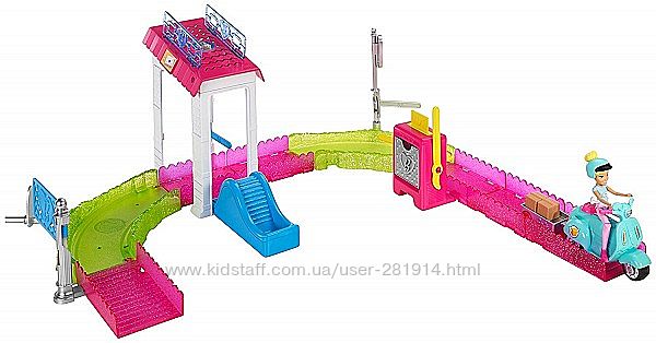 Сборный трек состоит из элементов почтовой службы и содержит открывающийся въездной шлагбаум, при открытии которого опускается знак Stop. Далее на пути движения почтового скутера встречаются другие интерактивные элементы, с которыми происходят различные действия после проезда транспортного средства. Комплект для игры оснащен звуковыми модулями и символикой с логотипами Barbie.