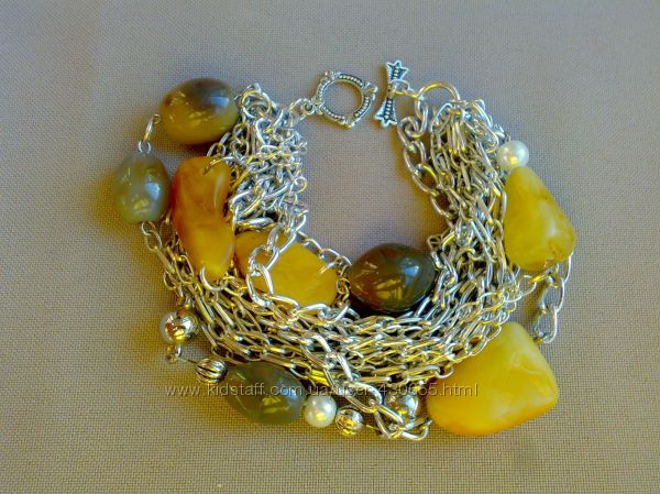 Кусочки светло-желтого янтаря естественной, природной формы и крупные агатовые бусины удерживаются многочисленными серебристыми цепочками разного плетения. Немного воображения, - и это уже обломки льда разных оттенков, несущиеся по бурной весенней реке.