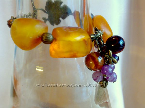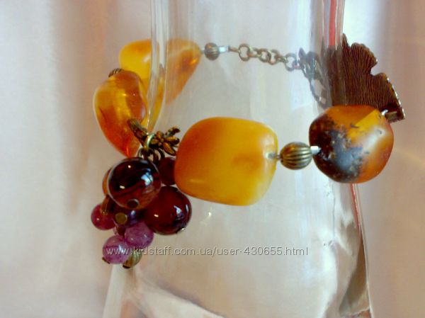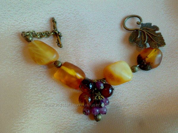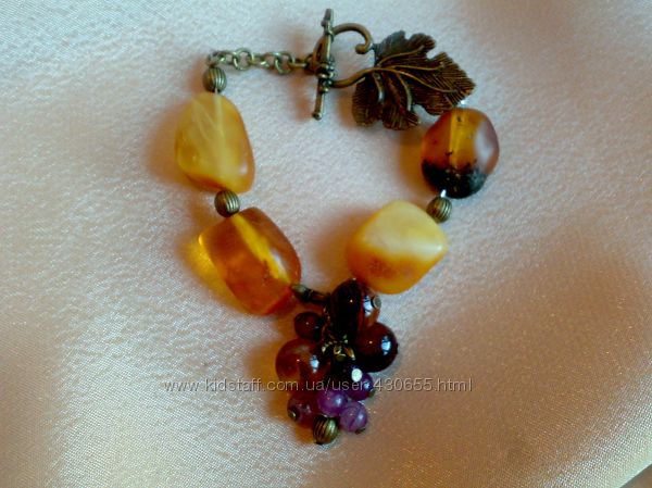 Изящный и очень эффектный браслет. Собран из крупных камней янтаря естественной природной формы. В центре - почти созревшая виноградная гроздь, состоящая из переливающихся на свету бусин сердолика и аметиста. Бронзовые бусинки и подвесочки делают браслет интереснее, как и красивая застежка – тогл в виде виноградного листа. Стильный, запоминающийся аксессуар.