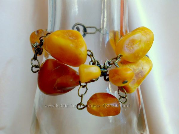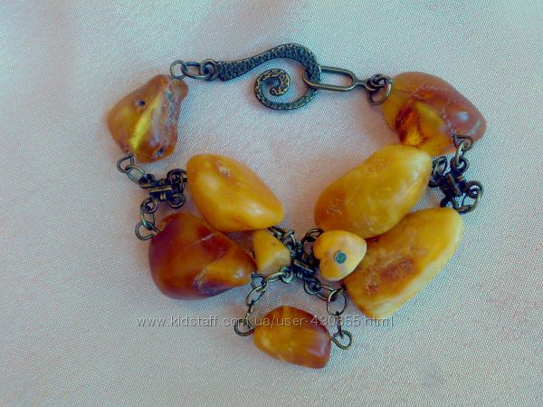 Браслет из натурального крупного янтаря и бронзовой фурнитуры. Камни сложные по фактуре, с сохраненной природной целебной корочкой, с трещинками и углублениями, подтверждающими их натуральное происхождение. При ношении браслета камни перемещаются, находят друг на друга, подобно перетекающим дюнам в пустыне.