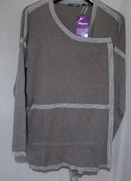 Vögele – швейцарский модный дом, специализирующийся на элитном текстилеКардиган новый с бирками (40€) в идеальном состоянии. Трикотаж средний (500 грамм), но тяжело ниспадающий и струящийся, очень эластичный, мягкий, не пушистый, меланжевого цвета какао или кофе с молоком с серыми каймами вдоль швов. Свободный прямой фасон, плечо занижено, широкие полы без застежек.