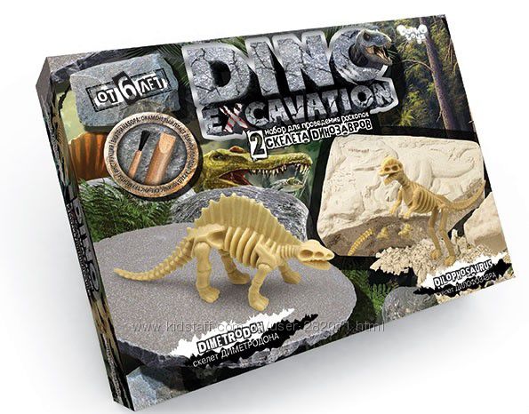 У набір входить скам´яніла земна порода, а завдання дитини - розкопки. Після завершення роботи трофеєм стануть скелети двох доісторичних динозаврів.