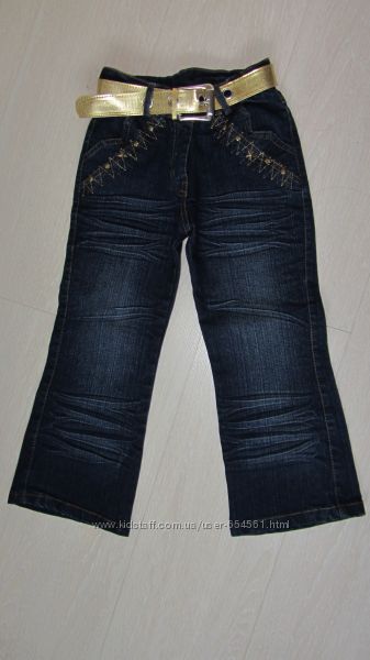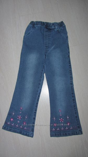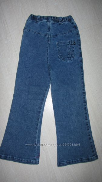 Фото 6-8- на рост 104-110 см, на худую девочку . Джинс хорошего качества, средней плотности, хорошо тянется в ширину (стрейч). Высокая посадка, п ояс на резинке + есть лямки для пояска. 2 кармана спереди (застрочены одинарной строчкой, при необходимости легко распускается и открывается доступ в карман), 1 карман сзади. Штанины внизу декорированы вышивкой и стразами. Внизу штанин совсем маленький клеш.