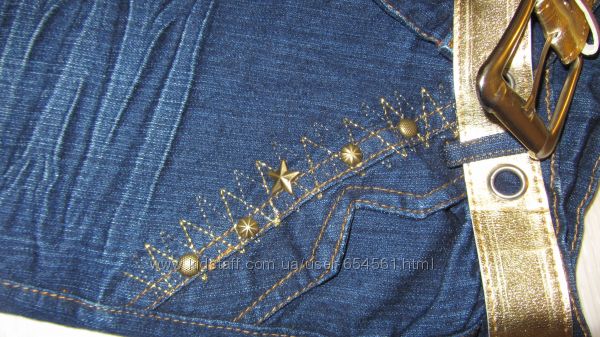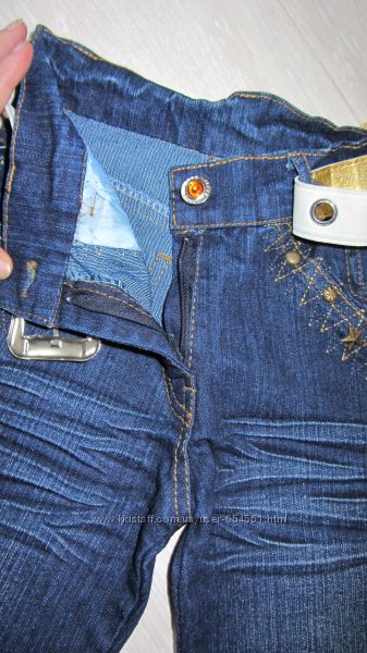 Фото 2-5 - на рост 110-116 см. Реальный цвет - фото 1,2,3. Качественный джинс, пояс прямой, без резинок, талия не занижена, есть лямки для пояска (пояс в комплекте). Застёгиваются на молнию и пуговицу. Декорированы "жаткой" на ткани и вышивкой с заклепками. 2 кармана впереди, 2 - сзади. Состав ткани: 65% котон, 35% - полиэстер.Замеры : длина - 64 см, шаговый - 43,5 см, обхват талии - 56 (+4)см, обхват бедер - 68 (+ еще пару-тройку) см.