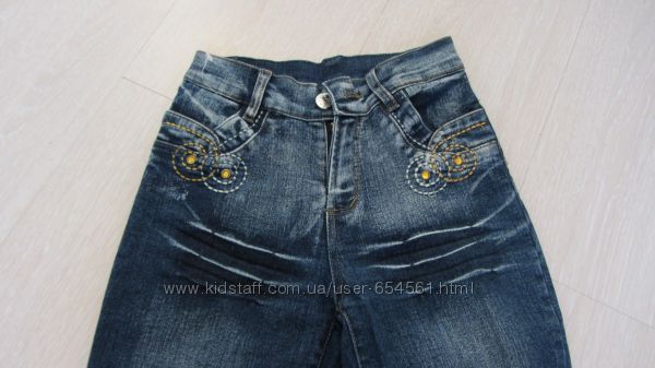 Хорошего качества джинсы с вышивкой впереди и сзади. Декоративная жатка на штанинах, карманы спереди и сзади. Есть лямки для пояса. Пояс прямой.Замеры: длинна - 79 см, шаговый - 55 см, обхват талии - 54 (+6) см, обхват бёдер - 74 (+8) см.