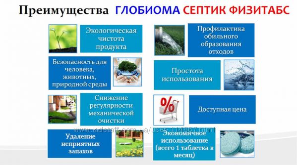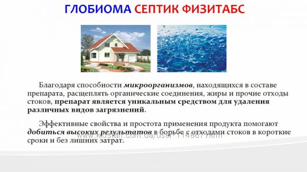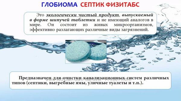 Глобиома Септик ФизиТабс (из США) экологически чистый продукт, выпускаемый в форме шипучей таблетки и не имеющий аналогов в мире.Он состоит из живых микроорганизмов, эффективно разлагающих различные виды загрязнений.