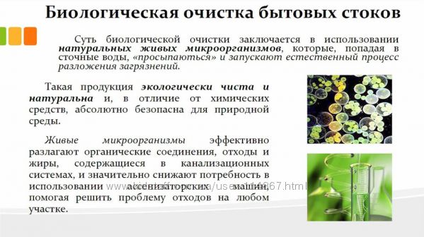 Это высоко концентрированная смесь микроорганизмов, отобранных научным путем из-за их повышенной способности переваривать жиры, масла, белки, крахмалы, моющие средства и другие органические и не органические отходы, которые накапливаются в водосточных трубах, септиках, выгребных ямах, уличных туалетах.