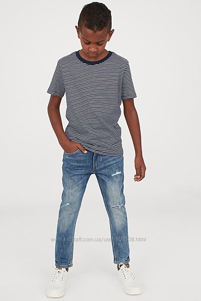 Джинси з п´ятьма кишенями з еластичного м´якого і приємного до тіла деніма з розривами і потертостями. Вільна посадка та звужені штанини.