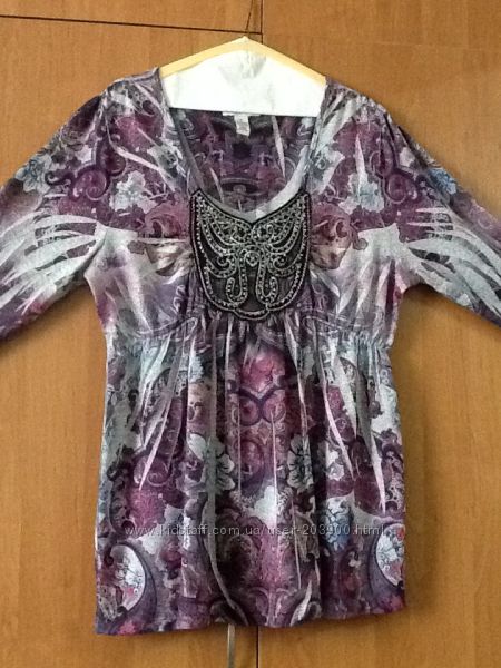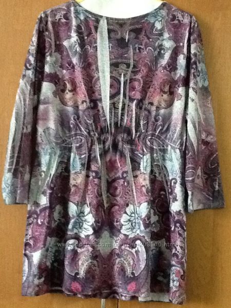 Симпатичная мягкая туника свободного фасона из хорошего мягкого трикотажа, на талии аккуратная легкая резинка, которая создает легкую драпировку, скрывает животик. Не полнит. Состояние нового, без ценника, поэтому подала в б/у. Размер наш 52-54. Объем туники в груди 108см, объем внизу 140см. Длина от плеча 74см, длина рукава 50см. Предоплата на карту. Доставка Новой почтой и Укрпочтой.
